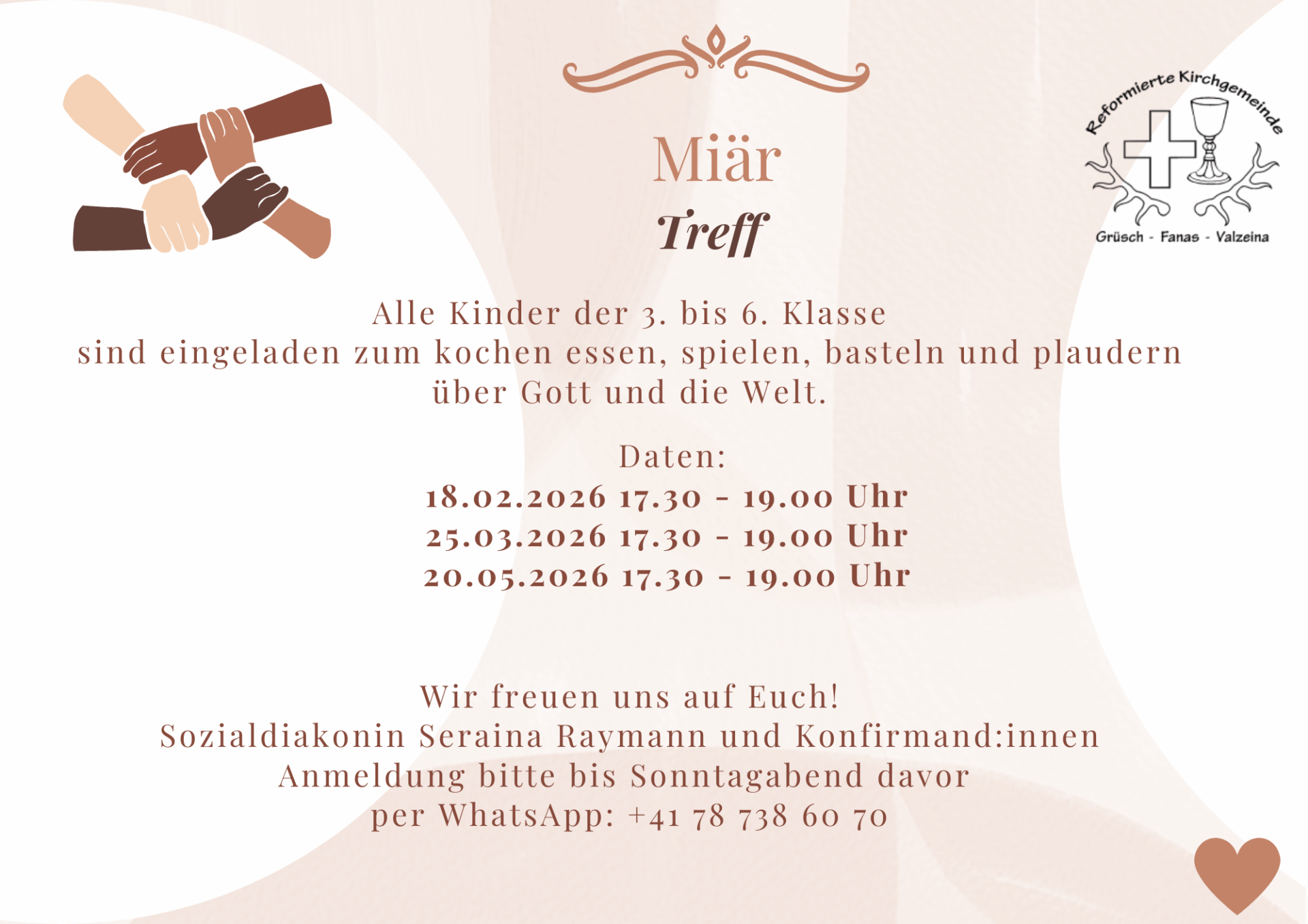 Anmeldung gerne per Whatsapp +41 78 738 60 70 bei Sozialdiakonin Seraina Raymann
